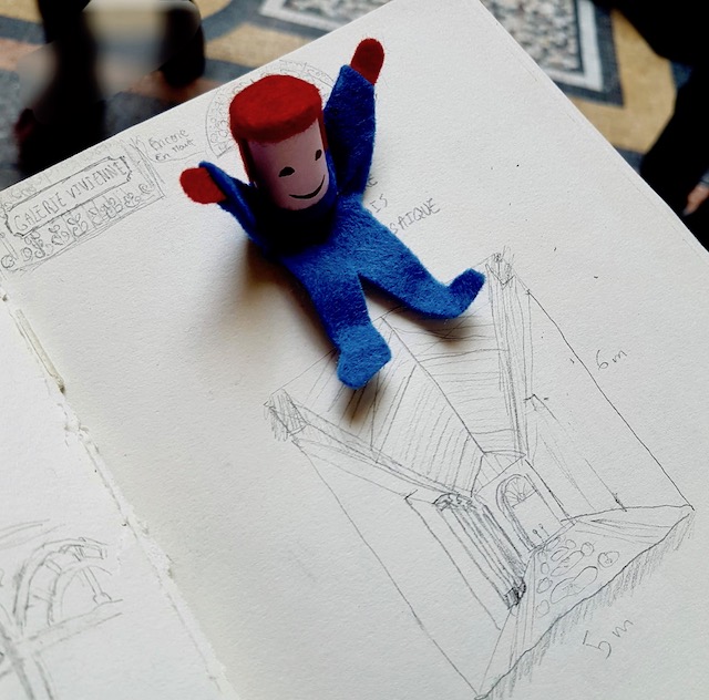 * Merci à l’élève de l’école de dessin en train de « croquer » la galerie Vivienne, d’avoir prêté au culbuto son carnet pour y faire une galipette !
