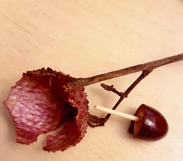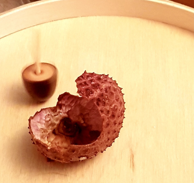 L’arrivée chez le Si Tu Veux d’une belle toupie multicolore m’a rappelé la chouette info que m’avait passé un pro du jeu : Faire, comme à La Réunion, des toupies avec des demi-noyaux de litchis et un pique olive.