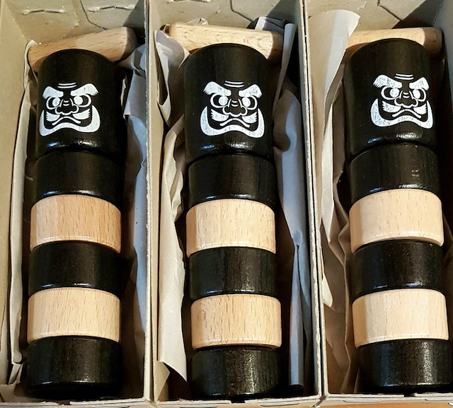 Ici en version Daruma Otoshi, c’est un jeu d’adresse où il s’agit de frapper les rondelles l’une après l’autre avec le marteau pour les retirer sans faire tomber les autres, jusqu’à ce qu’il ne reste plus que la tête.