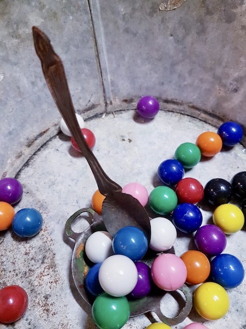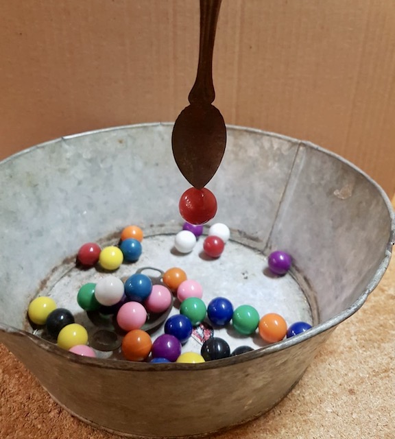 La cuillère en fer blanc carrément vintage sur laquelle s’aimante la bille étonne, surprend, fascine !!!!!