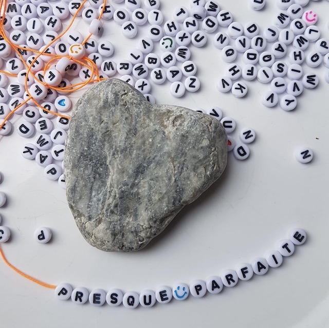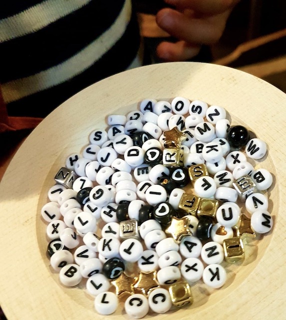 Bon bien sûr, j’y ajouter ma touche ludique qui pourrait servir à organiser un atelier perles lettres lors d’un goûter d’anniversaire : écrire son mot préféré avec 10 lettres piochées au hasard (on peut faire des échanges de lettres entre joueurs) / un message codé (cc- jtm : coucou- je t’aime) ou un compliment avec 2 mots qui commencent par la même lettre.