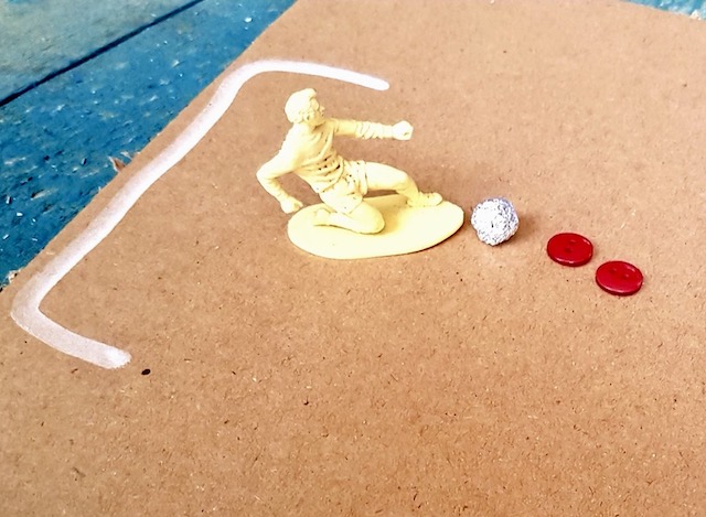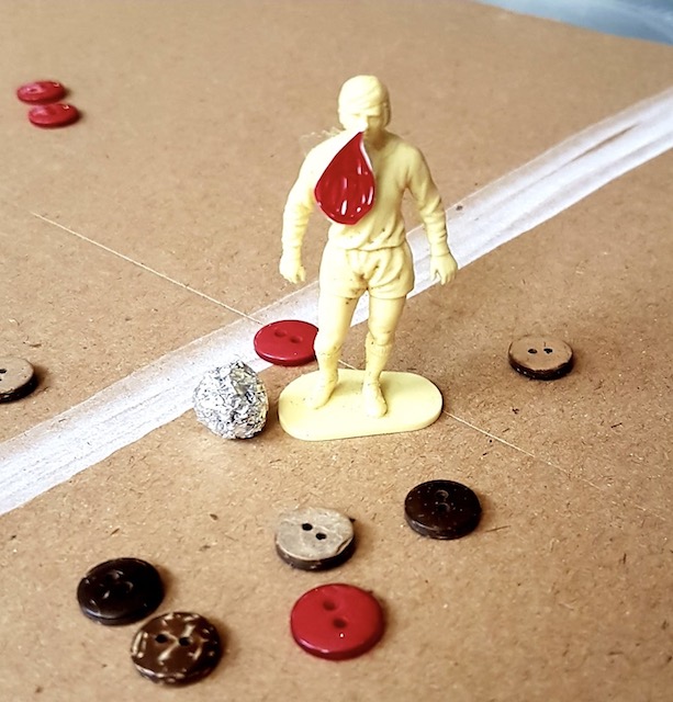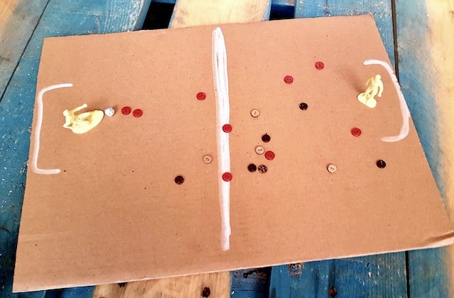On y joue à deux sur un terrain fait d’un bout de carton rectangulaire avec ligne médiane et buts ou un bout de papier de récup’ scotché sur une table. Chaque joueur a 11 boutons- équipe de foot (10 joueurs et un gardien) le ballon étant une boulette de papier d’alu.
