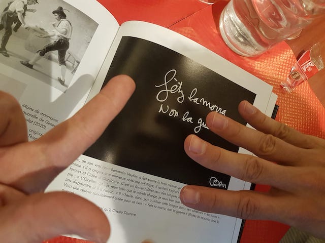 Et me voilà en train de le contredire, car oui, nous les initiés, savons bien que la mourre est un jeu d’adultes et de détente populaire pratiqué depuis l’antiquité/ traversant les siècles/ les pays /les continents et inspirant des écrivains ou artistes de Cicéron à Rabelais, Giono, Ben*… Sa pratique est même inscrite à l’Inventaire du patrimoine culturel immatériel français depuis 2012.