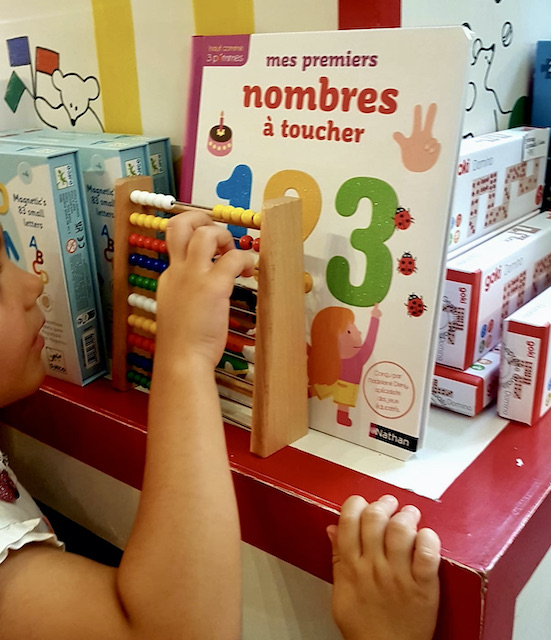 « Je pousse une boule, fais pareil sur la rangée en dessous. Maintenant je pousse les boules de chaque rangée et je les compte toutes, une boule jaune, deux boules rouges, trois boules bleues », et elle continue jusqu’à 100, laissant la plus petite béate d’admiration.