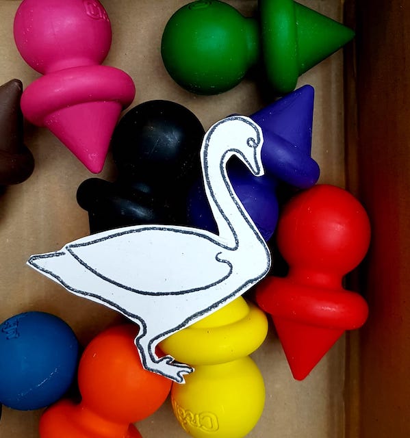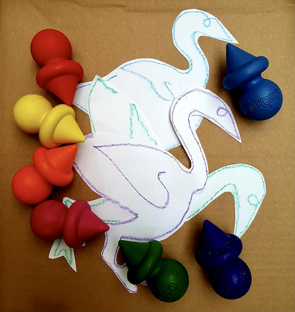 Eh oui j’avoue, j’ai piqué les crayons toupies des tout petits du Si Tu Veux pour mon dessin d’oie, ceux qui se tiennent bien en main pour faire de premiers tracés… ou d’excellents gribouillis .