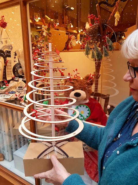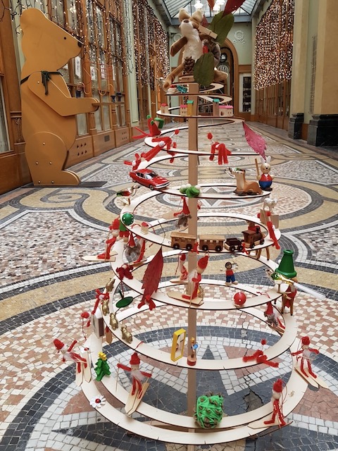 Moi je l’ai décoré de mille jouets et bricolines/ J’ai « planté » mon sapin de bois   dans une des vitrines du magasin de jouets de la galerie Vivienne/ J’ai fait : ouf, ça y est la shop est désormais tout ennoëlisée avec grandes et petites sapinettes tout en spirales !