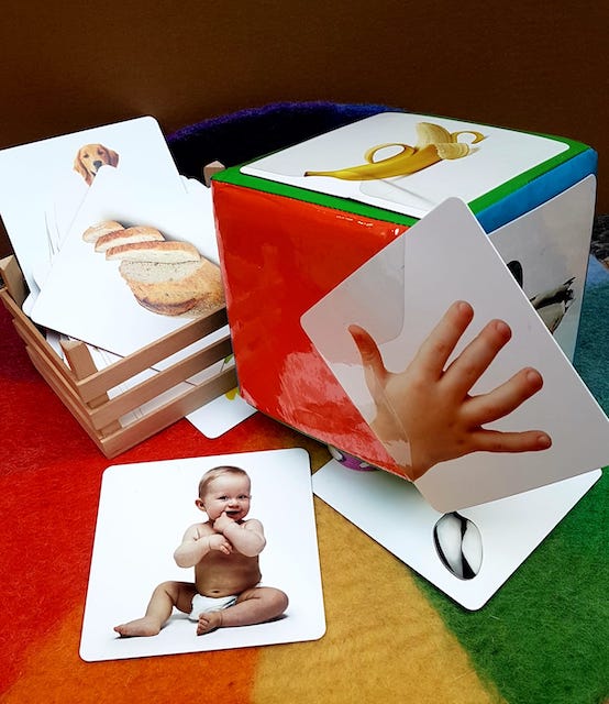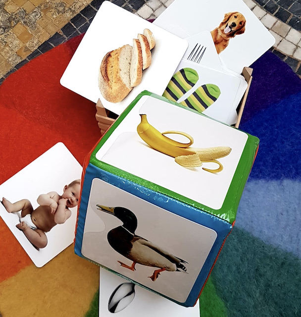 On glisse dans les pochettes ouvertes sur les faces du cube en tissu l’une ou l’autre des 60 photos illustrant des mots simples qu’on prononce à haute voix devant le jeune enfant.