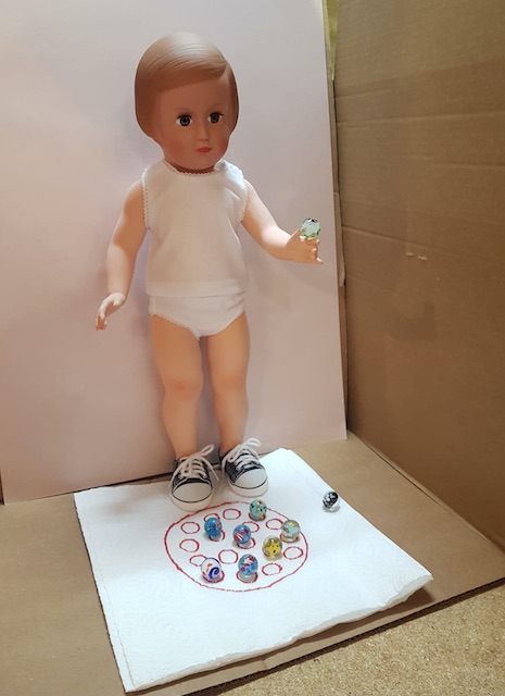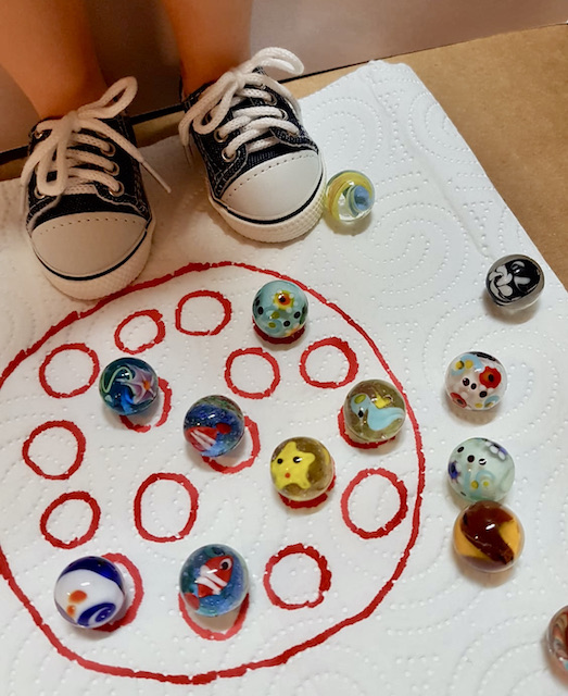 Un jeu de billes australien dont j’ai aménagé la règle pour qu’on puisse y jouer à l’intérieur et en famille.