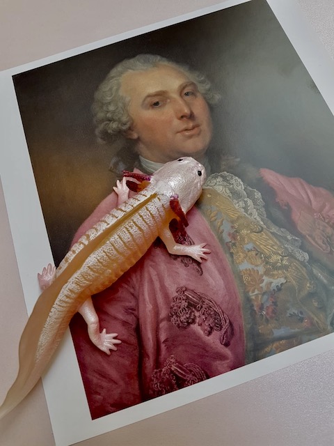 J’ai tout de suite eu envie d’associer cette charmante salamandre rose à l’une des pages du livre “Rose : histoire d’une couleur“ de Michel Pastoureau, avec ce chef des armées d’Empire tout vêtu de rose…