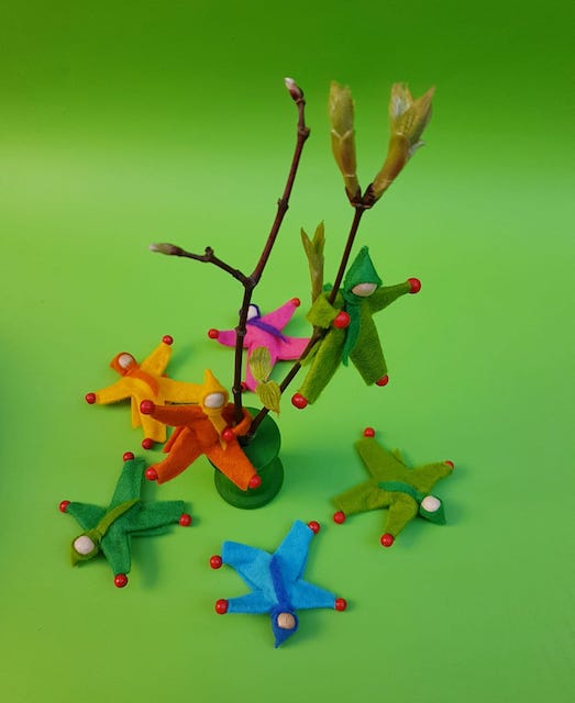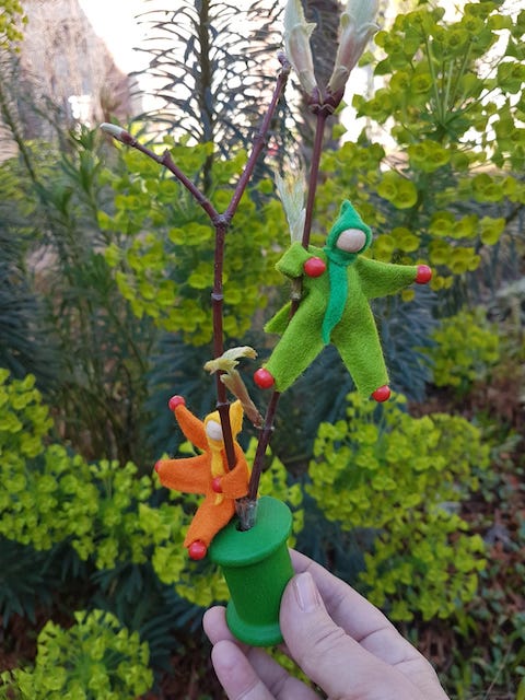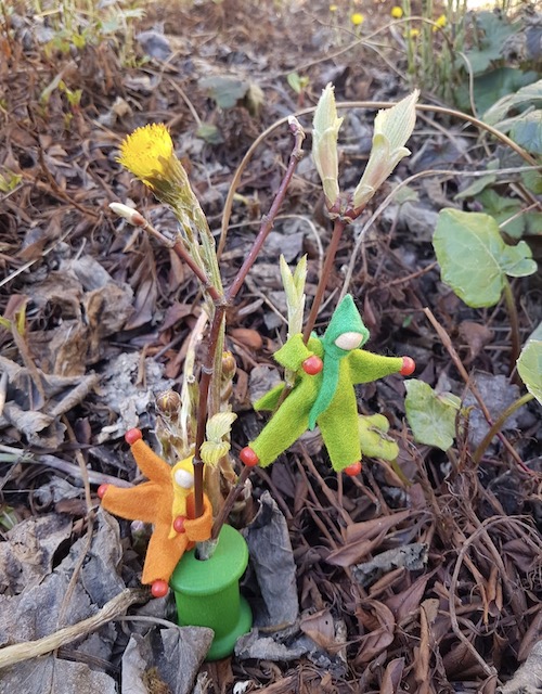 Quel est leur rôle ? Souffler de l’air chaud autour d’une branchette de bourgeons afin de les débourrer. « Fini le cocooning hivernal » chantonnent mes mignonnets personnages de feutrine d’une voix cristalline… Tous accrochés aux branchettes, ils poursuivent : « Va falloir faire péter les écailles des bourgeons pour nous montrer votre verte trombine ».