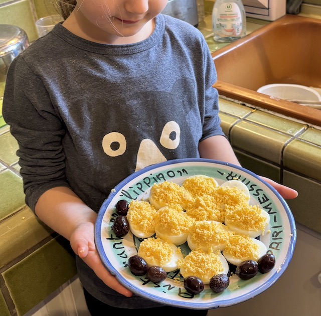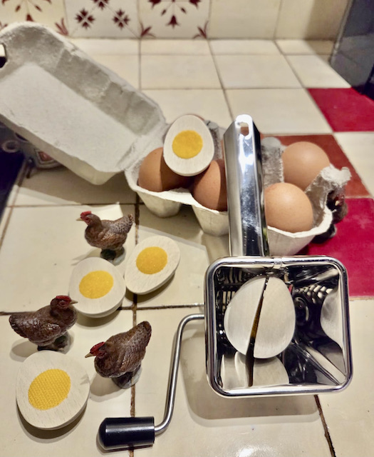 Top important aussi de préparer l’incontournable recette de Pâques : les fameux œufs mimosa !Chez nous on se bat pour utiliser l’ustensile jubilatoire, la moulinette manuelle qui transforme le jaune d’œuf dur en longues étamines imitant les fleurs du mimosa!