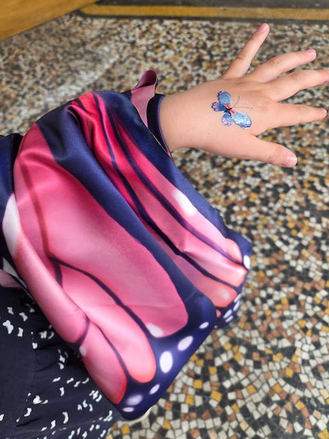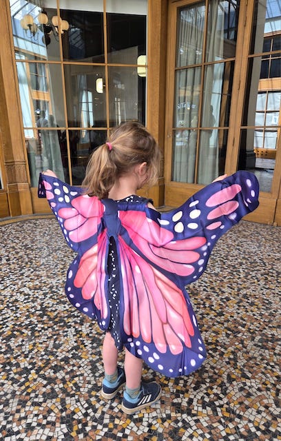 Déguisée en papillon, voilà qu’une de mes familiennes fait le show dans la galerie Vivienne, en agitant ses ailes soyeuses !