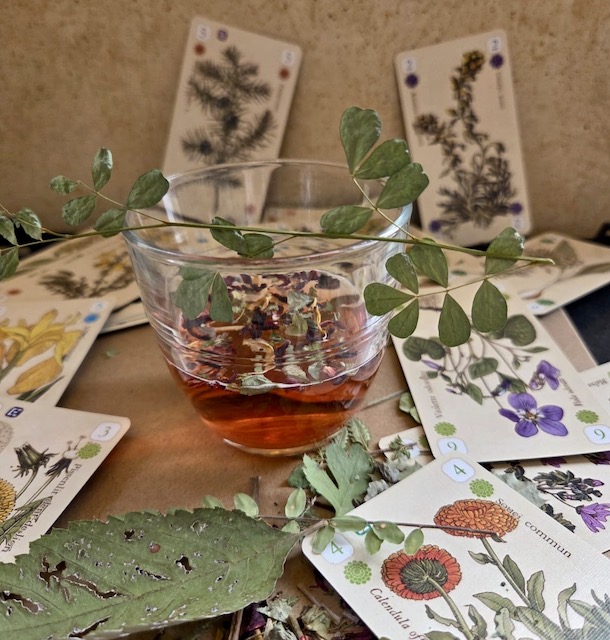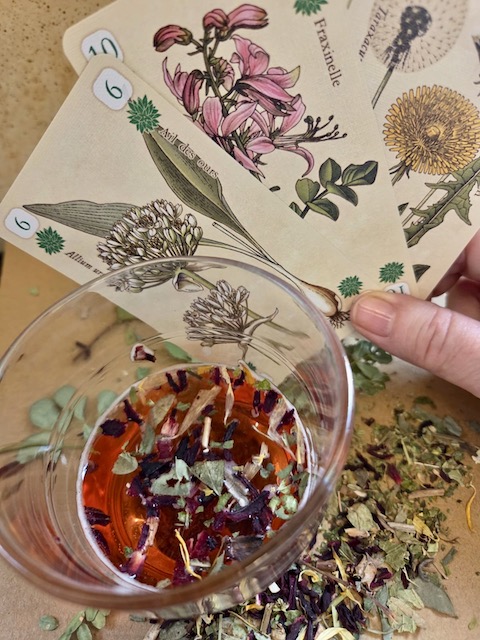 Les cartes des plantes toxiques sont bien sûr à refiler aux autres joueurs, juste histoire de gagner la partie … et d’aller vite chercher dans le frigo le réconfort pour tous : une tisane glacée aux délicats parfums et aux vertus toniques dont les cartes m’ont inspiré la composition, hibiscus et menthe.