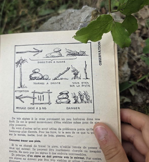 Quoi de mieux qu’un vieux guide scout trouvé dans un vide-grenier pour mettre en place un jeu de piste ou une chasse au trésor ? J’en ai copié les signes…