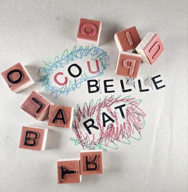 Un jeu de tampons et de lettres « total » expérience concrète de lecture de mots que l’on peut décliner autant qu’on le veut avec du sans O, sans A, sans I… sans parler des bons coups de tampons, frappés bien fort sur du papier tout récup’, qui défoulent !
