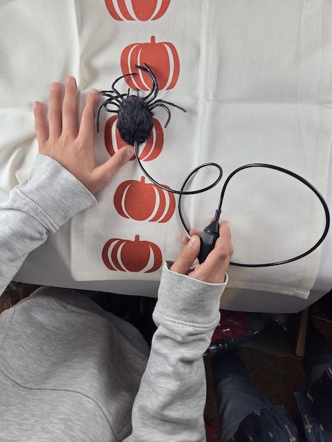 Un de mes familiens, passant galerie Vivienne, a testé mon idée de jeu en appuyant sur la poire de l’araignée-farce pour la faire sauter de citrouille en citrouille en moins d’une minute.
