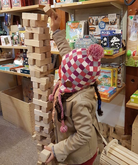 Je ne me lasse jamais de l’expérience sensorielle que m’apporte la texture du bois naturel des jouets du Si Tu Veux quand je les installe dans le magasin sur des tables et des étagères…