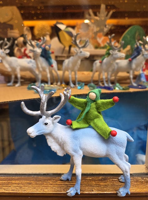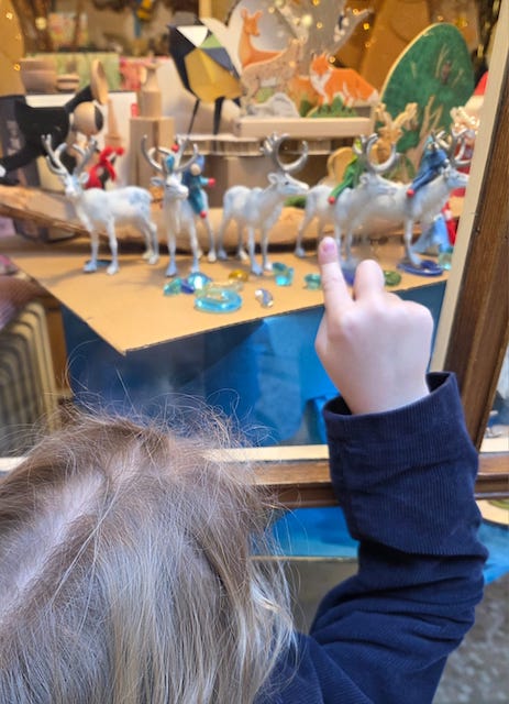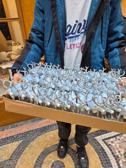 Son plaisir à bien faire est si bon à voir, comme ce rangement parfait de rennes pailletés sur un couvercle de carton qu’il a récupéré dans la poubelle ! Me reste plus qu’à en choper quelques-uns pour le décor de mes vitrines.