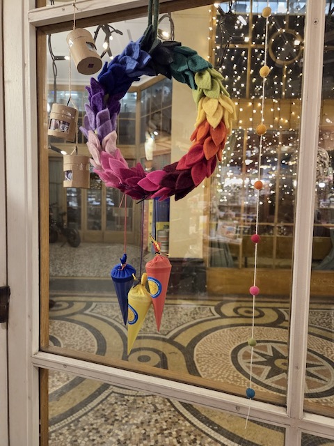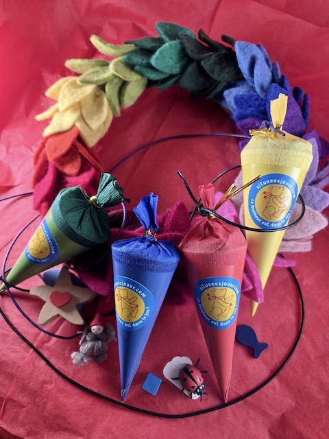 Gaies et colorées, garnies de loose parts et de porte-bonheurs, j’ai immédiatement trouvé un rôle festif à ces petites pochettes en les « invitant » à s’accrocher aux belles couronnes de l’Avent aux feuilles multicolores.