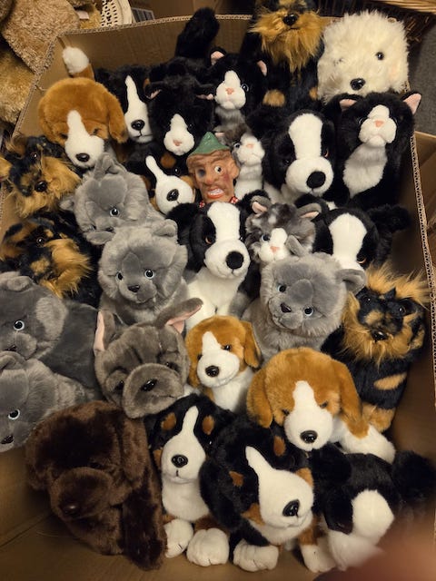 Ah, Ah, j’imagine ses gros yeux ronds de surprise quand il découvrira que j’ai glissé un intrus dans le big ++ carton de chiens et chats en peluche !