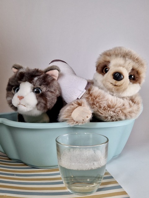 Faut d’abord préparer la mixture nettoyante : 1cuillère à soupe de vinaigre blanc + quelques gouttes de savon liquide, le tout dilué dans un verre d’eau.Versé dans une bassine ou la petite baignoire du Si Tu Veux, suffit alors de convaincre chaque animal en peluche de se laisser frotter avec le mélange avant d’être rincé avec une petite serviette humide.