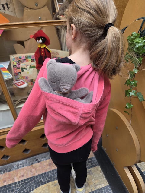 À tour de rôle ils sont de sortie, d’abord en mode portage en capuche sous la verrière de la galerie Vivienne…