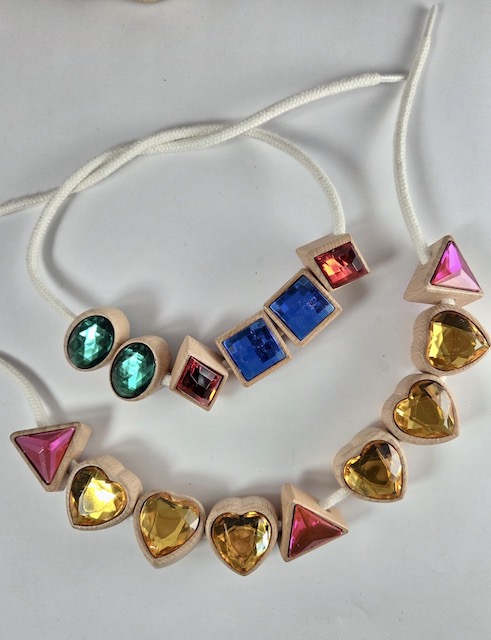 « Coco veut que tu enfiles sur le lacet 2 formes vertes, une rouge, 2 bleues et encore une rouge »