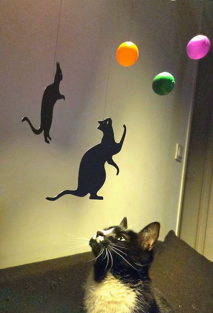 Sa passion pour le mobile aux chats est topissime ! Bien qu’il ne soit pas le seul … un chat coquin est à surveiller !