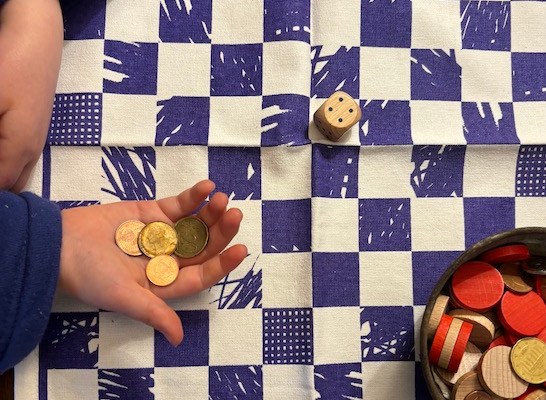 Au lieu de s’escagacer (s’ennuyer), alons joer (allons jouer) au dringuet avec moult (beaucoup de) pièces, un dé et un damier ! En