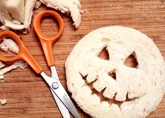 Zou, on découpe un rond dans une tranche de pain de mie, puis avec des ciseaux pointus c’est la découpe des yeux