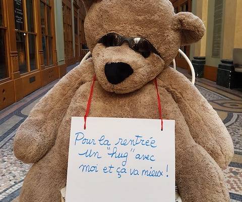 « Sympa votre petite pancarte », me dit un papa en photographiant l’ours en peluche big size de Si Tu Veux. Et