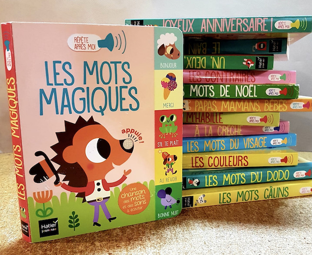 Les mots magiques/ Un, deux, trois/Les couleurs/ Les contraires/ Papa, maman, bébés/ Les mots du visage/Joyeux anniversaire/ Les mots de Noël/Les mots du dodo/ Les mots câlins/ Mes tout premiers mots/ Sur le pot/Les mots de la famille/ Les jouets/ Le repas