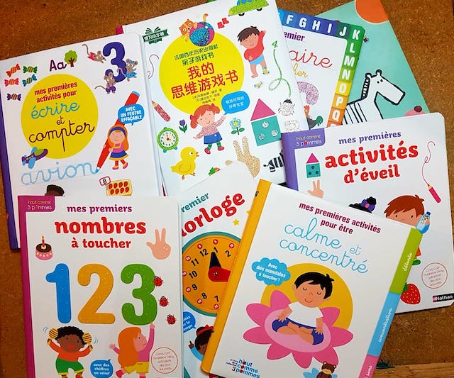 Toutes mes activités créatives/ Les nombres/ Abécédaire/ Mes premières activités d’éveil/ Mes premières activités d’école maternelle/ Dessins coloriages tracés gribouillages/ Mes premières activités pour écrire et compter/Mon premier livre horloge/Mes premières activités pour être calme et concentré/Mes premières activités de musique
