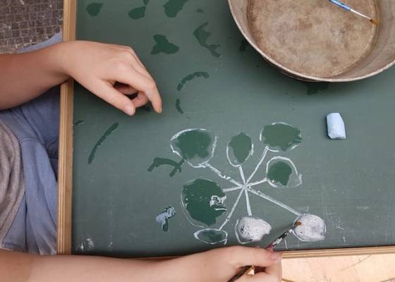 Ça y est ! Fait chaud ! Il est temps d’installer ma « table à dessin d’eau » devant le Si Tu Veux. Une